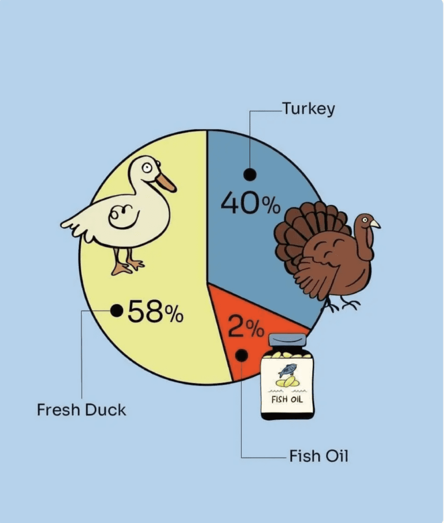 Turkey breast, duck breast, duck heart, duck liver, duck leg, fish oil.